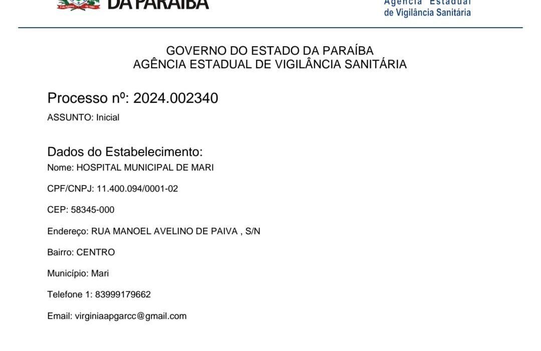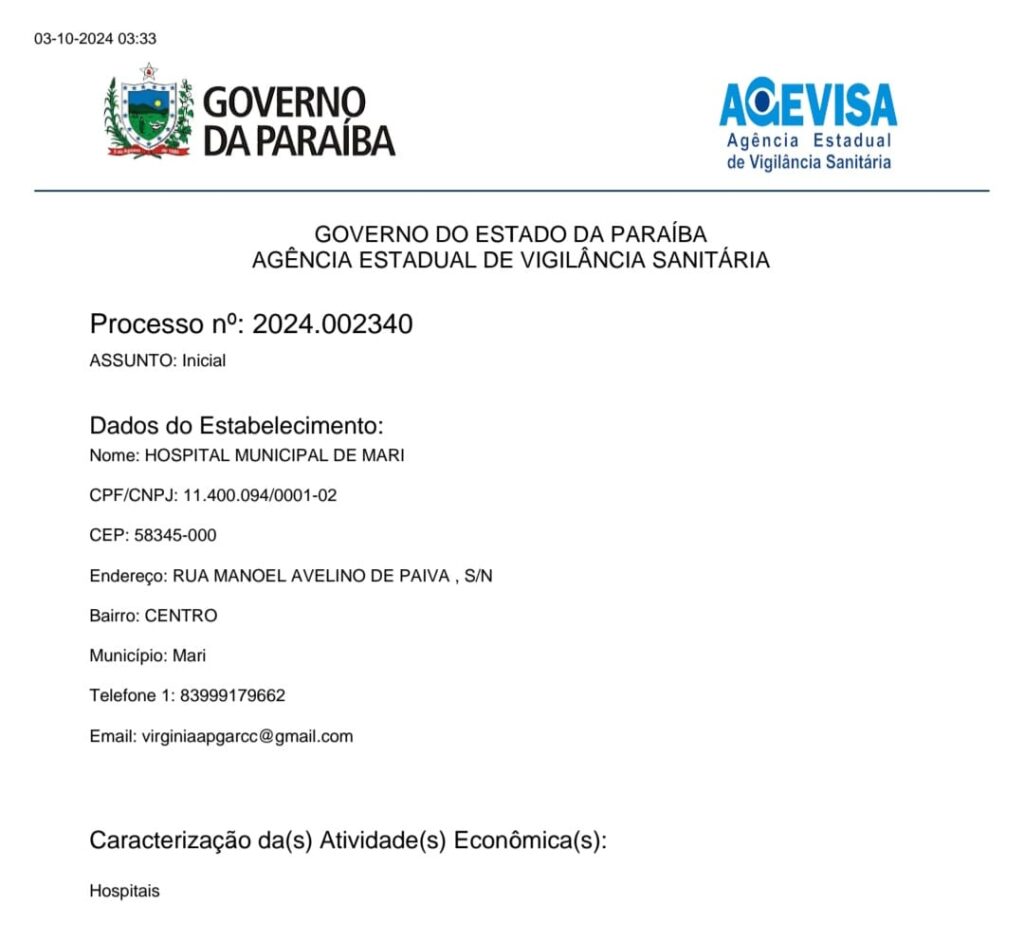 Com processo de registro de n°: 2024.002340, da Agência Estadual de Vigilância Sanitária, o estabelecimento de saúde, consta como caracterização das atividades encomomicas: Hospitais.
