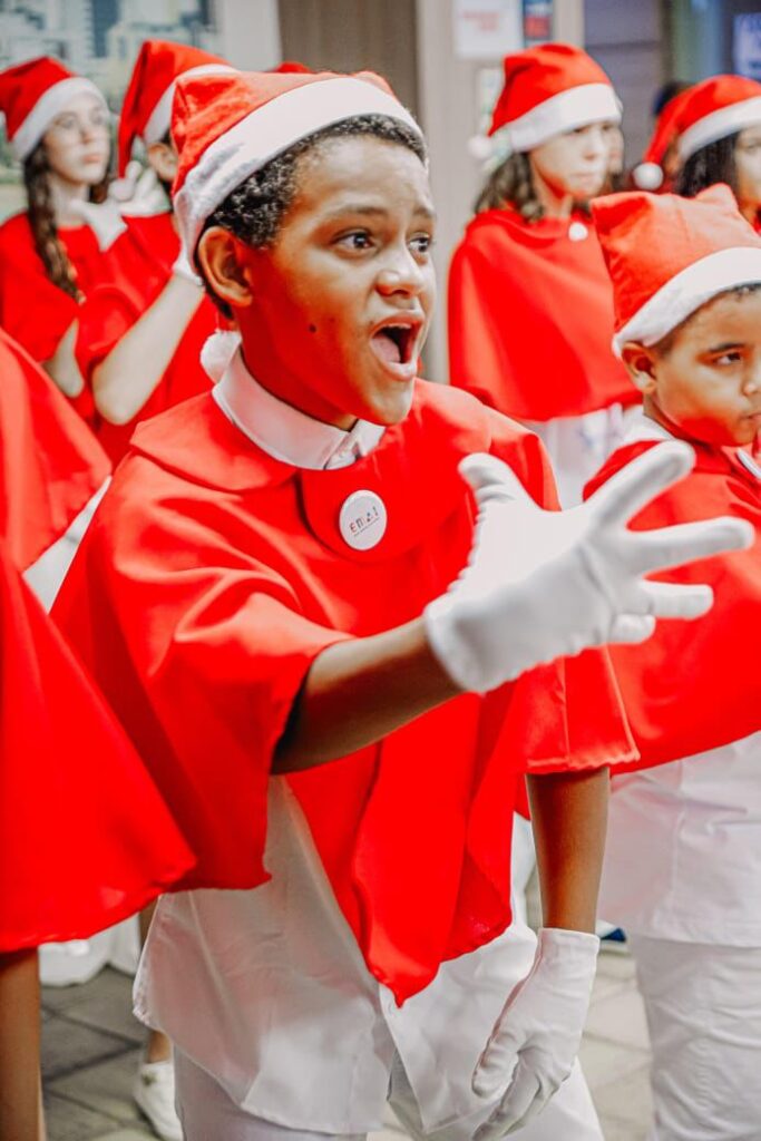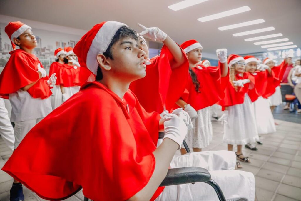 As crianças fazem parte das Escolas Municipais Ativas Integrais (EMAI) Celso Monteiro Furtado e Leonel Brizola. Esse é o primeiro coral formado por alunos da Rede Municipal de Ensino, composto por 30 alunos, sendo 24 surdos e seis ouvintes. As músicas apresentadas foram ‘Vem chegando o Natal’, ‘Natal todo dia’, ‘É Natal’, ‘Porque é Natal’, ‘Noite de Paz’ e ‘Brilha Jesus’.