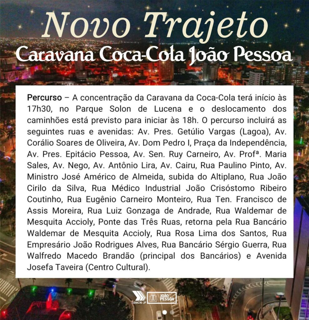 A Caravana Iluminada da Coca-Cola desfila pelas ruas de João Pessoa nesta quinta-feira (19). E pela primeira vez, o percurso vai incluir o Parque da Três Ruas, construído pela Prefeitura de João Pessoa no bairro do Bancários. A segurança viária dos espectadores e a mobilidade no entorno do trajeto por onde vai passar a Caravana serão realizados pela Superintendência Executiva de Mobilidade Urbana (Semob-JP).