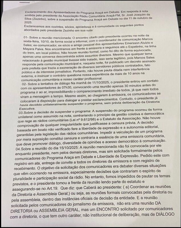 Em contraponto os comunicadores também apresentaram uma nota e entendem estarem sendo injustiçados pelo presidente tendo como causa uma disputa política que tentam envolver a Araçá FM.