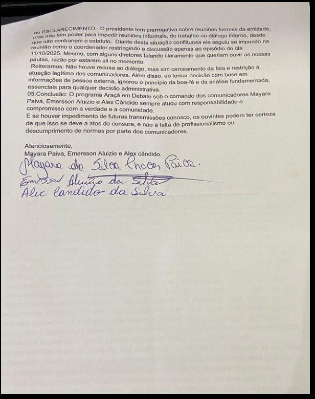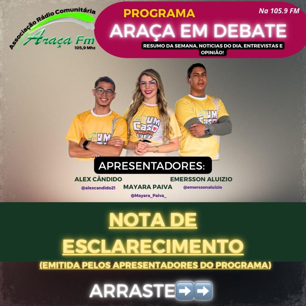 Os comunicadores Mayara Paiva, Emerson Aluízio e Alex Cândido emitiram uma nota no último sábado (18) com a versão deles sobre a suspensão do programa Araçá em Debate do dia 11, quando o presidente da emissora, Zezinho do Evangelho, decidiu suspender o referido programa sem apresentar justificativas.
