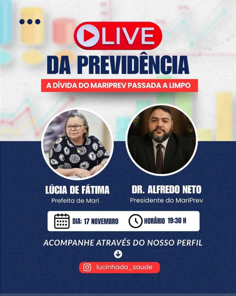 Chegou a hora de conhecer toda a verdade sobre a Previdência Municipal. A gestão tem compromisso com a transparência, e por isso a Prefeita Lúcia de Fátima (Lucinha da Saúde) e o Presidente do MariPrev, Dr. Alfredo Neto, estarão juntos em uma live especial para explicar, de forma clara e responsável, a real situação da dívida previdenciária do município.