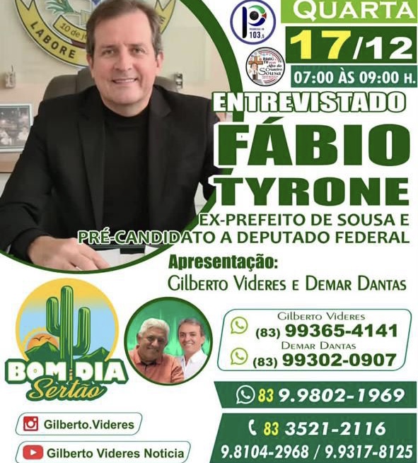 O ex-prefeito de Sousa, Fábio Tyrone, será o entrevistado desta quarta-feira, 17 de dezembro, no programa Bom Dia Sertão, em uma conversa que promete repercutir fortemente no cenário político da Paraíba.