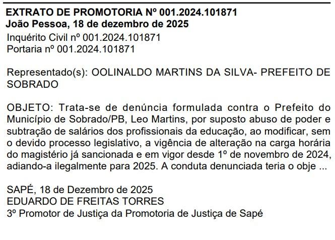 O Ministério Público da Paraíba ampliou a investigação contra o prefeito de Sobrado, Olinaldo Martins da Silva, conhecido como Leo Martins, por suspeita de abuso de poder administrativo envolvendo direitos dos profissionais da educação. O caso, que tramitava como procedimento preparatório, foi convertido em inquérito civil público pela Promotoria de Justiça de Sapé, diante da gravidade dos fatos e da necessidade de aprofundar as apurações.