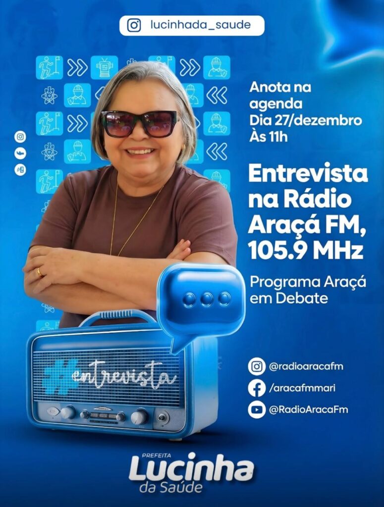 Mari vai parar para ouvir! Neste sábado, dia 27 de dezembro, às 11h, a Prefeita Lucinha da Saúde será a grande entrevistada do Programa Araçá em Debate, na Rádio Araçá FM 105.9 MHz.